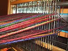 To prepare to weave, the warp must be made. By hand this is done with the help of a warping board. The length the warp is made is about a quarter to half yard more than the amount of cloth needed. Warping boards come in a variety of shapes, from the two nearest door handles to a board with pegs on it, or a device called a warping mill that looks similar to a swift.[10] Warping the loom, mean threading each end through an eye in a heddle, and then sleying it through the reed. The warp is set (verb) at X ends per inch. It then has a sett (noun) of X ends per inch. The weft is measured in picks per inch.
