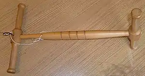 Alternating sets of threads are lifted by connecting them with string or wires called heddles to another bar, called the shaft (or heddle bar or heald). Heddles, shafts and the couper (lever to lift the assembly) are called the harness — the harness provides for mechanical operation using foot- or hand-operated treadles. After passing a weft thread through the warp, a reed comb is used to beat (compact) the woven weft.[10]