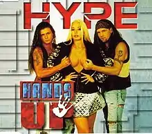 "Hands Up" is a 1995 song by Norwegian Eurodance group Hype, consisting of singer Linda Johansen and two rappers.[1] It is a cover of the 1981-single by the French pop music duo Ottawan and peaked at number 10 in Norway.[2] In Finland, it was a even bigger hit, reaching number 7. A controversial music video featuring frequent nudity with brief modesty bars was also made for the song. Swedish band Army of Lovers had a number 44 hit in Sweden in 2001 with their cover version.[3]