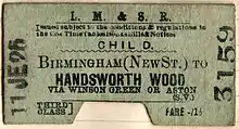 1925 LMS Birmingham to Handsworth Wood Third Class Child Railway Ticket