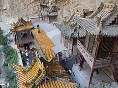 The Hanging Temple, also Hengshan Hanging Temple, Hanging Monastery or Xuankong Temple (simplified Chinese: 悬空寺; traditional Chinese: 懸空寺; pinyin: Xuánkōng Sì) is a temple built into a cliff (75 m or 246 ft above the ground) near Mount Heng in Hunyuan County, Datong City, Shanxi Province, China. The closest city is Datong, 64 kilometres (40 mi) to the northwest. Along with the Yungang Grottoes, the Hanging Temple is one of the main tourist attractions and historical sites in the Datong area. Built more than 1,500 years ago, this temple is notable not only for its location on a sheer precipice but also because it is the only existing temple with the combination of three Chinese traditional philosophies or three religions (三教): Buddhism, Taoism, and Confucianism. The structure is kept in place with oak crossbeams fitted into holes chiseled into the cliffs. The main supportive structure is hidden inside the bedrock.[1] The monastery is located in the small canyon basin, and the body of the building hangs from the middle of the cliff under the prominent summit, protecting the temple from rain erosion and sunlight bake.