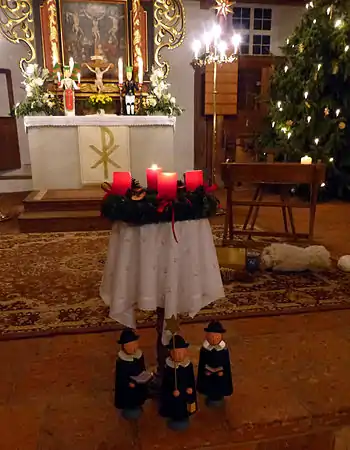 The hanging of the greens is a Western Christian ceremony in which many congregations and people adorn their churches, as well as other buildings (such as a YWCA or university), with Advent and Christmas decorations.[1][2][3] This is done on or directly before the start of the Advent season, in preparation for Christmastide.[4] The service involves the placement of evergreen vegetation in the parish.[5] Items such as the evergreen wreath, in Christianity, carry the religious symbolism of everlasting life, a theological concept within that faith.[5][6][7] As such, during the liturgy, "Biblical passages and other readings help explain the significance of the holly, the cedar, the Advent wreath, the Chrismon tree, and any other special decorations".[8][9] Christmas trees are frequently erected during the hanging of the greens, although they are sometimes left bare until Christmas Eve.[10]