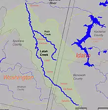 Latah Creek (/ˈleɪtə/ LAY-tə), also known as Hangman Creek,[1] is a large stream in eastern Washington and north central Idaho in the United States. The creek flows northwest from the Rocky Mountains to Spokane, where it empties into the Spokane River. It drains 673 square miles (1,740 km2) in parts of Benewah and Kootenai counties in Idaho, Spokane County and a small portion of Whitman County in Washington, where over 64 percent of its watershed resides. Some major tributaries of the approximately 60-mile (97 km) creek include Little Latah Creek (also known as Little Hangman Creek) and Rock Creek. The average flow of the creek can range from 20 cubic feet per second (0.57 m3/s) to 20,000 cubic feet per second (570 m3/s).[4][5] Latah Creek receives its name from a Nez Perce word likely meaning "fish". In 1854, the creek received another name, Hangman Creek, from a war between the Palouse Indians and white soldiers, which resulted in several Palouse being hanged alongside the creek.