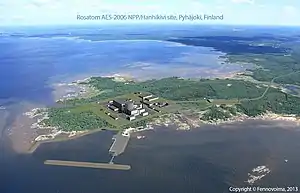The Hanhikivi Nuclear Power Plant (Finnish: Hanhikiven ydinvoimalaitos, Swedish: Hanhikivi kärnkraftverk) was a project to build a nuclear power plant on the Finnish Hanhikivi peninsula, in the municipality of Pyhäjoki. It was planned to house one Russian-designed VVER-1200 pressurised water reactor, with a capacity of 1200 MW.[1][2] It was estimated that the reactor would supply 10% of Finland's energy demand by 2024.[3] The power company Fennovoima announced in April 2021 that construction of the plant would begin in 2023 and commercial operation would start in 2029.[4] In May 2022, in the wake of the Russian invasion of Ukraine, Fennovoima terminated its contract with Rosatom to build the power plant.[5]