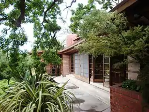 The house is one-story high with a central clerestory[9] (an outside wall of a room or building that rises above an adjoining roof and contains windows) and is constructed of native redwood board[7] and batten, common wire-cut San Jose brick,[5] concrete and plate glass. The house clings to, and completes the hillside on which it was built as the floor and courtyard levels conform to the slope of this one and one-half acre site. The entire site includes the main house, a guesthouse, hobby shop, storage building, double carport, breezeway, and garden house with pools and water cascade.