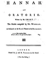 In order to help produce his first oratorio, Smart turned to John Worgan to compose the score.[5] Smart previous worked with Worgan when Worgan composed the score for Smart's Solemn Dirge, a poem written on the death of Frederic Prince of Wales.[5] After the two finished, they advertised in the Public Advertiser on 21 February 1764 that Hannah would run three days at the end of March.[2] The show was supposed to be performed on 30 March and 31 March, but it was cancelled because it was Lent and they were unable to find singers.[2] Eventually, Hannah was performed for only one night, 3 April 1764.[5]