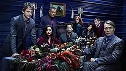Several first season main and recurring Hannibal cast members, from left to right: Dancy (Will Graham), Dhavernas (Alana Bloom), Fishburne (Jack Crawford), Abrams (Brian Zeller), Chorostecki (Freddie Lounds), Park (Beverly Katz), Thompson (Jimmy Price), Mikkelsen (Hannibal Lecter).