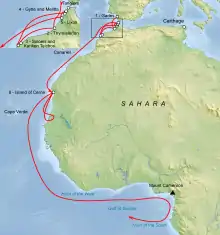 The gold trade was a foundation of the Carthaginian empire since the fifth century BC. It may have been the original motivation for Carthaginian exploration of sub-Saharan Africa.[18] The purpose of Hanno's voyage was to secure the gold route to west Africa.[12]