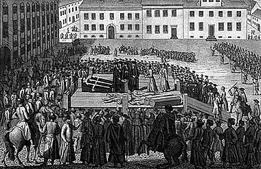 On 16 and 17 March 1726, the Jesuits were celebrating the feast day of Corpus Christi[lower-alpha 2] when Jesuit student of a monastery complained that Lutherans who were watching the procession did not take off their hats or kneel before the statue of Mary. Fights on both sides ensued, and a Jesuit monastery was damaged.[8]
