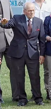 Winkler won five gold medals in jumping (in addition to the four individual medals with the German team) between 1956 and 1976, as well as a silver medal and a bronze medal.[6] He is one of the most successful German Olympic athletes, third only to Isabell Werth and Reiner Klimke for gold medals produced in German equestrian competition. He was German Sportspersonality of the Year in 1955 and 1956.[7][8] Winkler retired from jumping on 13 July 1986 with the conclusion of the Aachen tournament.[3] Winkler worked as a trainer for the German Olympic teams, along with Paul Schockemöhle and Herbert Mayer, leading them to success in Seoul in 1988.[2] He consulted companies who wanted to sponsor equestrian sport, organized tournaments, and worked for the development of young riders.[8]