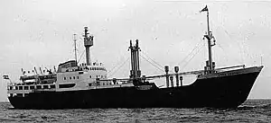 On 29 January, she began her return journey.[6] The ship had 40 crew, 55 passengers and a cargo of frozen fish on board[1] and in addition to that 3.25 tons of archives concerning Greenlandic history.[7][8][9] One of her passengers was the Danish parliament (Folketing) member Augo Lynge.[5] The next day, Hans Hedtoft collided with an iceberg about 35 nautical miles (65 km) south of Cape Farewell, the southernmost point of Greenland.[6] A distress call was given at 13:56 (local time) stating that the ship had hit an iceberg at 59°30′N 43°00′W.[5] The call was answered by USCGC Campbell, the West German trawler Johannes Krüss[1] of Bremerhaven[5] and another West German trawler. Within an hour, another message was sent stating that the engine room was flooded.[1] At 15:12, it was announced that the ship was sinking. A final message was sent at 17:41 stating the ship was slowly sinking and requesting immediate assistance.[5] Aircraft in Newfoundland were grounded by the weather and unable to assist in the search for Hans Hedtoft.[1] The beginning of an SOS was received by Johannes Krüss at 18:06 after which communication with Hans Hedtoft was lost.[5] On 31 January, USCGC Campbell reported that conditions were worse than anything the ship had seen while on transatlantic convoy duty during World War II, and there was no sign of Hans Hedtoft or her passengers and crew.[10] The search was called off on 7 February.[6] The only piece of wreckage ever recovered was a lifebuoy which washed ashore on Iceland and was discovered on 7 October 1959, some nine months after the ship sank.[5] The ship sank with parish registers from parishes of Greenland, which were meant to be deposited in archives in Denmark, causing a major loss for Greenlandic genealogy.[11]
