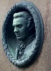 Initially, Winterfeldt was buried at his estate of Barschau; a hundred years later, his body was transferred to the Invalidenfriedhof (military cemetery) at Berlin. A statue, which stands on the Wilhelmplatz there, was erected to his memory, and another was erected in the Bodemuseum on the Museumsinsel. Another forms part of the memorial to Frederick the Great at the boulevard Unter den Linden.[4] In 1851 his name was inscribed on Frederick the Great's Equestrian Statue.[6]