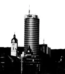 Immediately after World War II ended, following Soviet leadership, reconstruction in Jena had emphasized preserving the historically developed structure of East German cities, as well as regional building styles. This policy changed in the 1960s when the central government put emphasis on new and modern buildings. In Jena this change was materialized by an urban plan centered around building a massive skyscraper, the Jen-Tower, within the intimate urban core of the city in 1968–1969. The skyscraper was meant to be a research facility for the VEB Zeiss, and also to symbolize architecturally the victory of socialism in Germany. Walter Ulbricht, the Socialist Unity Party leader, personally pushed for these developments in early 1968 during a visit to Jena. To accommodate this massive structure, VEB Zeiss would raze much of the old inner city. The activists that fought against the tower's construction nicknamed it "penis jenensis" taking advantage of its tall cylindrical shape.[3]