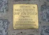 Following the 20 July failed attempt to assassinate Hitler, Josef Bürckel, Gauleiter of Gau Westmark where Germersheim was located, pressed Heinrich Himmler, who was the Reich's Security Official, to have Sponeck executed in retribution for the assassination plot, even though the latter had no contact with the German military resistance.[11] On Himmler's orders, Sponeck was shot to death on 23 July 1944.[12] Sponeck was buried in Germersheim and no citations or speeches were permitted at his grave. After the war, Sponeck's remains were transferred to the Soldiers' Cemetery at Dahn in the Palatinate Forest.