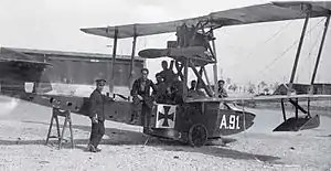 | Umberto Calvello with personnel of 261st Squadron next to the wreckage of A91 shotdown and captured on 4 May 1918 | |
