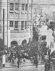 The protestors stormed the Hyogo Prefecture Office Building, and held the governor, the prefectural police chief, and officers of the Allied Occupation as hostages in an attempt to coerce them to rescind their decision to close the Korean ethnic school.[1][2][3] While an agreement was briefly agreed upon, the Japanese and the U.S. government broke the deal, declared a state of emergency in Hyogo, and arrested thousands of Koreans living throughout the city.[1][3]