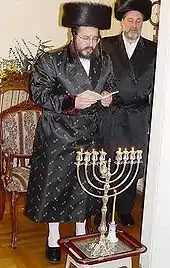 Hanukkah is observed for eight nights and days, starting on the 25th day of Kislev according to the Hebrew calendar, which may occur at any time from late November to late December in the Gregorian calendar. The festival is observed by lighting the candles of a candelabrum with nine branches, commonly called a menorah or hanukkiah. One branch is typically placed above or below the others and its candle is used to light the other eight candles. This unique candle is called the shammash (Hebrew: שַׁמָּשׁ, "attendant"). Each night, one additional candle is lit by the shammash until all eight candles are lit together on the final night of the festival.[5] Other Hanukkah festivities include singing Hanukkah songs, playing the game of dreidel and eating oil-based foods, such as latkes and sufganiyot, and dairy foods. Since the 1970s, the worldwide Chabad Hasidic movement has initiated public menorah lightings in open public places in many countries.[6]