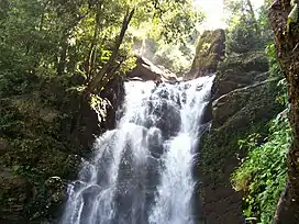 Hanumanagundi Falls is located between Karkala and Lakya Dam in the Kudremukh national park. Hanumanagundi Falls has an elevation of 996 m (3,268 ft).[1][2] The water falls from a height of 22 m (72 ft) and is a tiered waterfall.[3] Hanumanagundi Falls is situated at a distance of 79 km (49 mi) from Mangalore.[4]