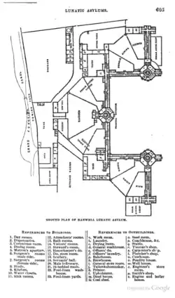 Hanwell became a model for future hospitals and was copied and modified by the designers of countless other asylums across England and Wales (for example Horton, Colney Hatch, Claybury, or Springfield). The main alternative design being the villa plan (for example Chalfont or Shenley).[17]