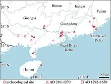 Fossil evidence as well as historic documents all indicate that Hanyusuchus inhabited what is now South China, with fossils found in Jiangmen and Foshan (Guangdong District). Much of the known material has been subjected to accelerator mass spectrometry radiocarbon dating, revealing their age to roughly correlate with the Bronze Age approximately 3300 to 2900 BP. The osteoderms were not analyzed by Iijima and colleagues, however older research estimated their age to be 5000 to 4900 BP. Historic reports are notably more recent, dating from the Han Dynasty (specifically 210–127) to possibly as recent as the Ming Dynasty (ca. 1630). The reports gathered from South China indicate their presence ranging from at least Nanning in the west to the Han River delta in the east. Reports are also known from the northern parts of Hainan Island.[1]