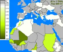 E-M132 is found most often in West Africa, and today it is especially common in the region of Mali. One study has found haplogroup E-M132 Y-chromosomes in as much as 34% (15/44) of a sample of Malian men, including 2/44 E-M44 and 13/44 E-M33/M132(xE-M44).[7] In particular, the Dogon people of Mali have been found to carry haplogroup E-M132 with a frequency as high as 45.5% (25/55). This makes it perhaps the most common Y-DNA haplogroup in this population, though haplogroup E-P1 appears to be almost equally frequent among the Dogon (24/55 = 43.6%).[3] Another study has found haplogroup E-M132 in 15.6% (44/282) of a pool of seven samples of various ethnic groups in Guinea-Bissau.[4] Haplogroup E-M132 also has been found in samples obtained from Moroccan Berbers, Sahrawis, Burkina Faso (including E-M33/M132(xE-M44) in 2/20 = 10% Fulbe and 2/37 = 5.4% Rimaibe[2]), northern Cameroon (including E-M44 in 9/17 = 53% Fulbe and E-M33/M132(xE-M44) in 3/15 = 20% Tali[2]), Senegal (7/139 = 5.0%[8]), Ghana (1/29 = 3% Ga, 1/32 = 3% Fante[3]), Sudan (including 5/32 = 15.6% Hausa and 3/26 = 11.5% Fulani[5]), Egypt (1%[3]-1.4%[9]) Calabria (including both Italian and Albanian inhabitants of the region), 1 Italian (from 67 tested) from Trentino in northeastern Italy,[10] and Romanians from Constanţa.[11]