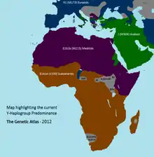 - Trombetta (2015). "Phylogeographic Refinement and Large Scale Genotyping of Human Y Chromosome Haplogroup E Provide New Insights into the Dispersal of Early Pastoralists in the African Continent". Genome Biology and Evolution. 7 (7): 1940–1950. doi:10.1093/gbe/evv118. PMC 4524485. PMID 26108492.