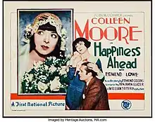 Happiness Ahead is a lost[1] 1928 silent film drama directed by William A. Seiter and starring Colleen Moore and then husband and wife Edmund Lowe and Lilyan Tashman. It was produced by First National before it acquired by Warner Brothers. Moore was married to the producer John McCormick who frequently produced her films and they held rights to their films. Moore donated copies of her films to the Museum of Modern Art (MOMA) and over the years the archive allowed the films to decay including Happiness Ahead.[2][3]