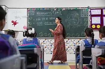 The curriculum was praised by several media outlets, including Le Monde,[22] World Economic Forum,[11] and NPR,[23] and was called a reformative step towards school education in India.[24] Happiness classes have been visited by several institutional heads, academicians, officials from education departments of other state governments in India and abroad.[25][26][27][28] Versions of the curriculum have been adopted by Indian states Andhra Pradesh and Uttarakhand.[29][30] Afghanistan, Nepal, and the United Arab Emirates are also preparing to implement similar programs.[31][32]