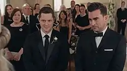 "Happy Ending" was written by Schitt's Creek co-creator and executive producer Daniel Levy, who directed the episode alongside Andrew Cividino. Writing for the season took about a month, as Levy tried to make sure he was giving each character the ending they deserved.[5] However, the finale was written in the span of three hours,[6] with Levy stating that the final script made him,[7] along with other cast members, cry several times during the episode's final table read.[8][9] As there weren't any minor characters with unresolved side stories, Levy was able to focus his attention mainly on addressing the Rose family.[5]