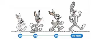 Thorson had been approached by Tedd Pierce, head of the story department, and asked to design a better rabbit. The decision was influenced by Thorson's experience in designing hares. He had designed Max Hare in Toby Tortoise Returns (Disney, 1936). For Hardaway, Thorson created the model sheet previously mentioned, with six different rabbit poses. Thorson's model sheet is "a comic rendition of the stereotypical fuzzy bunny". He had a pear-shaped body with a protruding rear end. His face was flat and had large expressive eyes. He had an exaggerated long neck, gloved hands with three fingers, oversized feet, and a "smart aleck" grin. The result was influenced by Walt Disney Animation Studios' tendency to draw animals in the style of cute infants.[11] He had an obvious Disney influence, but looked like an awkward merger of the lean and streamlined Max Hare from The Tortoise and the Hare (1935) and the round, soft bunnies from Little Hiawatha (1937).[12]