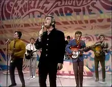 "Happy Together" was released as a single in January 1967, backed with the Warren Zevon-penned "Like the Seasons".[45][46] To promote the single, the band members performed in a couple of shows, including The Smothers Brothers Comedy Hour in February.[47][48] The Turtles would be called to perform on The Ed Sullivan Show in May 14, 1967, [49]and again, as a quintet, on November 12 (Tucker had left for personal reasons).[50][51] During this time, Douglas had left the Turtles to produce the Monkees.[33] His replacement was Jim Pons, formerly from the Leaves.[22] With Pons, they participated in a film shot in March that consisted of "the group running, jumping, rolling and mugging in a park in Los Angeles". Guitarist Tucker said in an interview that the park location was possibly Griffith Park.[52][53]