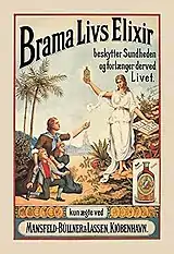 Mansfeld-Büllner launched an advertisement campaign for "Brahma-Livs-Elixir" which was a huge success. The product became so known that it was parodized in the revue Nytaarsnat 1872-73 at the Casino Theatre in Amaliegade and later that same year again in the comic operetta Malabarenken.[2]