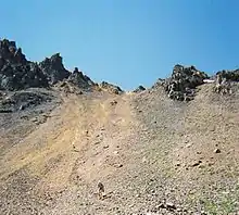 The run starts and ends in Silverton, Colorado and travels through the towns of Telluride, Ouray, and the ghost town of Sherman, crossing thirteen major passes in the 12,000' to 13,000' range. Entrants must travel above 12,000 feet (3,700 m) of elevation a total of 13 times, with the highest point on the course being the 14,048' summit of Handies Peak.[1] The race has been held in early July of each year beginning in 1992, except for 1995 (too much snow), 2002 (nearby forest fires), 2019 (trail damage due to avalanche), and 2020 (global pandemic). Each year's race is run in the opposite direction of the previous year's event (2008 was run in the clockwise direction, 2009 was counter-clockwise). In order to complete the event, instead of crossing a finish line, runners are required to "kiss the Hardrock", a picture of a ram's head painted on a large block of stone mining debris.