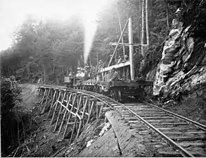 The route was surveyed in the summer of 1895.[9]: 6 As local labor was used as much as possible, the actual work of grading the roadbed was delayed until the haying season was over. Much of the roadbed was cut from the sides of the hills, and grading was done with hand tools, wheelbarrows, and horse-drawn carts.[3]: 52? [9]: 7 Five miles of roadbed were graded in 1895, and the remainder was graded in the summer of 1896.[9]: 6 Grading work came to a halt when the ground froze, and the first rails were laid thereafter.[3]: 52 Wooden trestles were built to span gorges along the right of way. In a process that continued until 1904, the trestles were subsequently replaced with "grout" or waste stone, which was used to fill the ravines.[3]: 52 The fill was "fine" grout from the cutting sheds, as large blocks falling could have destroyed the trestle structures.[12] The largest—and last filled—of the gorges took 6,600 carloads of grout.[7]: 23 [3] Varnum & Gilfillan, a St. Johnsbury-based contracting concern, was hired for culvert construction and trestle filling. This company brought Italian immigrant labor from Boston, preferring this source to the less-reliable local farmers who often left to tend their farms.[6]: 2 These newcomers, who drank wine and beer, caused some consternation among the sober townspeople, but they did not cause much actual trouble. A number of them stayed and worked in the granite finishing shops, becoming pillars of the community.[3]: 52