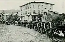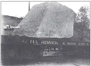 Largely as a result of the World’s Columbian Exposition in 1893, granite became a very popular building material for commercial and government buildings.[11][8]: 224 While the finer-grained granite of Barre was preferred for monuments and gravestones, the coarser-grained Woodbury stone found a market in "architectural" uses such as buildings and paving.[2] As demand grew, the granite-finishing operations in Hardwick began to look farther afield for sources of the raw stone. While some quarries had been opened in nearby Woodbury,[1]: 93–105 transportation of the stone to the finishing sheds was problematic: it was slow and difficult, and caused significant damage to the roads. The limitations of horse-drawn wagons would prevent much further growth in the local industry.[3] Ordinarily, a horse was needed for every ton of granite hauled by wagon.[9]: 4 It once took an 18-horse team three days to move a large column of rough granite from the quarry to Hardwick (a distance of 6 miles (9.7 km) or more, depending on the route), after which 20 road culverts needed to be rebuilt.[3][7] Such a team might be followed by a one-horse wagon loaded with axes, shovels, peavies, and other tools to repair the damage.[12] Transportation was somewhat easier in the winter, as the frozen ground would not give way, and snow allowed the use of sleds, which encountered less friction.[9]: 5