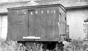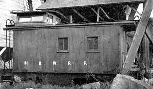 The railroad company’s charter allowed it to suspend service in the winter,[16] and the front page of the local freight tariff always included a notice that carriage was "subject to the right to suspend operations upon statutory notice" from December through March.[3]: 53–54 However, the railroad did not close for the winter throughout its operation[3]: 54 although there were some shorter closures late in its existence.[20]: 22 As a result, snow was an issue for the railroad.[17] The railroad's first snowplow was built by the railroad’s first engineer; it had to be removed and attached to the other end of the locomotive at each switchback.[7]: 25 Around 1900, this plow was replaced with a plow obtained from a timber railroad. This proved unsatisfactory, and a second-hand plow was bought from the St. Johnsbury & Lake Champlain when that railroad obtained a new one. This third plow served the H&W for the rest of its existence.[7]: 25 For lighter snowfalls, the railroad had a "flanger", designed by a conductor and built in Lyndonville. It was built on a single long truck and was quite effective.[3]