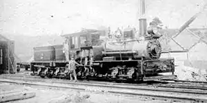 The railroad’s first locomotive was the 4-4-0 Hinkley rod locomotive it leased from the Boston & Maine.[9]: 6 When this engine outlived its usefulness (largely because it could not ascend the steeper grades beyond Burnam Hill[9]: 7 ), the company bought a Shay locomotive (whose gear drive enabled it to handle steeper track) from the Barre & Chelsea.[9]: 7, etc. This was given the number 1 and named E.H. Blossom for the railroad’s general manager.[3]: 53 It had two trucks and eight 32.5-inch (82.5 cm) drive wheels, and weighed 40 tons.[9]: 11 This locomotive was used for the rest of the construction of the line, and then was the railroad's only service locomotive for several years.[3]