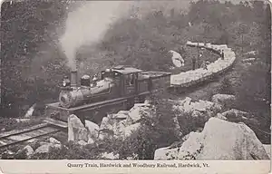 ![]() Hardwick & Woodbury locomotive No. 3 pulls a quarry train, as depicted on a 1917 postcard. | |