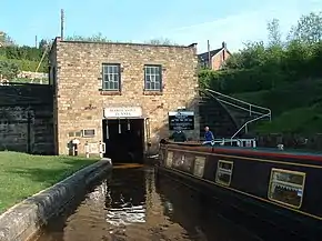 Harecastle Tunnel is a canal tunnel on the Trent and Mersey Canal in Staffordshire between Kidsgrove and Tunstall. The tunnel, which is 1.6 mi (2.6 km) long, was once one of the longest in the country. Its industrial purpose was for the transport of coal to the kilns in the Staffordshire Potteries. The canal runs under the 195 m (640 ft) Harecastle Hill near Goldenhill, the highest district in Stoke-on-Trent.[1]