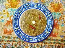 Harisa (Armenian: հարիսա, romanized: harisa) is traditionally served on Easter day, and is considered a national dish of Armenia.[3] It is a thick porridge made from korkot (dried or roasted cracked wheat) and fat-rich meat, usually chicken or lamb. Herbs were substituted for meat in harissa when Armenian religious days required fasting and penance. The extremely long cooking process is an essential part of the harisa tradition. Like other ritual dishes, the time taken for preparation is part of its cherished value.[3]