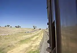 ![]() Junee-Harefield Road at Harefield viewed from a CPH railmotor on the Main southern railway line | |