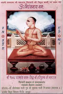 Hagiographies in Brajbhasha (a literary dialect of Hindi) report that Haridas was a native of Kapadod village near the town of Didwana in modern-day Rajasthan.[1] Some hagiographical sources suggest that he was a dacoit before being converted to the worship of nirguṇ rām by a holy man (sometimes identified as the yogi Gorakhnath). Haridas is recognized as the founder of the Niranjani Sampraday, a bhakti religious community primarily based in central Rajasthan. Most of Haridas's poetic compositions are in the form of hymns (pad) and diptyches (sākhī), but he also composed several longer works in various meters.