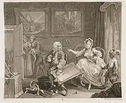 Moll is now the mistress of a wealthy Jewish merchant, as is confirmed by the Old Testament paintings in the background which have been considered to be prophetic of how the merchant will treat Moll in between this plate and the third plate. She has numerous affectations of dress and accompaniment, as she keeps a West Indian serving boy and a monkey. The boy and the young female servant, as well as the monkey, may be provided by the businessman. The presence of the servant, the monkey and the mahogany table of tea things all suggest the merchant's wealth has been made in the colonies.[11] She has jars of cosmetics, a mask from masquerades, and her apartment is decorated with paintings illustrating her sexually promiscuous and morally precarious state. She pushes over a table to distract the merchant's attention as a second lover tiptoes out. |