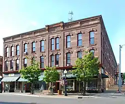 The Harlow Block, built in an Italianate style,[2] exemplifies late nineteenth century vernacular commercial architecture.[3] The rectangular building is three stories tall and constructed of red Lake Superior sandstone[3] of a type locally known as "raindrop" for its iridescence.[2] The building measures extends 75 feet along Front Street and 146 feet along Washington Street, and is built on a sloping lot such that the ground floor is substantially covered in the rear of the building.[4]