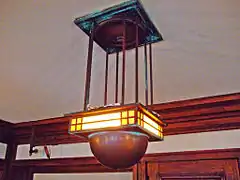When Harold C. Bradley, a biochemistry professor at the UW and a founder of the Hoofers Club, married Josephine Crane,[6] her grandfather Richard T. Crane built this house for them as a present.[7] Money was not a concern, and Crane hired the prestigious Chicago firm of Louis Sullivan to design a large home in the then-popular Prairie style. The house is two stories with a T-shaped footprint, with distinctive cantilevered sections that hold sleeping porches.[8] (A sleeping porch was a way to deal with hot summer nights before there was air conditioning.)[6] At the back is a porte-cochère. The architects also designed furniture, rugs, draperies and fixtures inside.[8] Though Sullivan was the principal of the firm, George Elmslie may have designed much of the house and furnishings.[7]