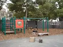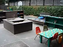 The Jones CSC preschool has an outdoor play area that is accessible virtually all day long via sliding doors and partially protected by an overhead canopy. Catherine Landreth, a former director of the school and designer of the building, worked with Joseph Esherick to create a space where the development of children would be highlighted. This included the careful planning of ceiling heights and placement of activity centers. In most other preschools, the ceilings tend to be low which emphasizes the height of adults in relation to children. Esherick and Landreth believed that a higher ceiling would shift the observers' focus from the height differential of the people occupying the space to the activities taking place. The activity centers were constructed to keep the children engaged by placing items at the child's eye level.[5] Landreth wanted a place that did not impose learning but encouraged them to engage in activities that interests the child.[6] According to a study on the physical environment for a child's development, crowding might be linked to psychological distress among children.[7] The guiding philosophy behind the preschool is that a child's environment can positively affect development.[8]