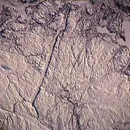 ![]() Harp Lake as seen from space. North is on the left. | |