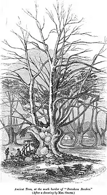 Then for reasons detailed by Harriet Grote in her Account of the Hamlet of East Burnham, they decided to leave the area.[2] According to Francis George Heath, writing on Burnham Beeches in 1879, "no right of estovers has belonged to the commoners of East Burnham, and the lord of the manor ... had alone the sole right of touching the trees."[31] Grote's work deals in part with "commoners' rights and privileges, and ... her efforts to maintain them on behalf of her poor neighbours".[32] In 1885, when the East Burnham Common was bought by the Corporation of London, it was considered that the commoners had rights of pasture and turbary, but not estovers.[33] There is evidence, however, that pollarding of the trees did occur in conjunction with pasturage.[34]