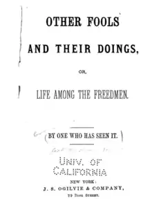 This article incorporates text from this source, which is in the public domain: Goff, Harriet Newell Kneeland; One who has seen it (1880). Other Fools and Their Doings, Or, Life Among the Freedmen (Public domain ed.). J. S. Ogilvie.