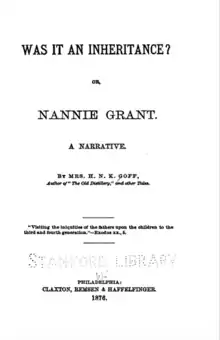 This article incorporates text from this source, which is in the public domain: Goff, Mrs. H. N. K. (1876). Was it an Inheritance?; Or, Nannie Grant: A Narrative (Public domain ed.). Claxton, Remsen & Haffelfinger.